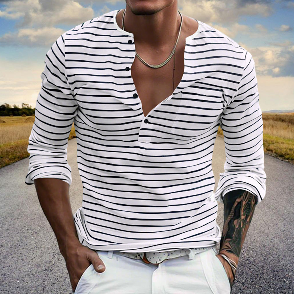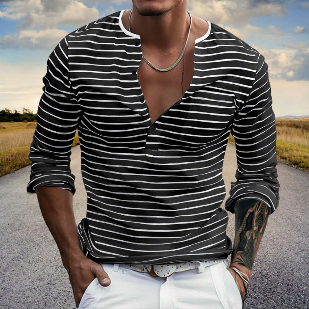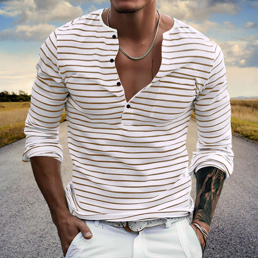 Men’s Striped Long Sleeve Henley-Style Casual T-Shirt
