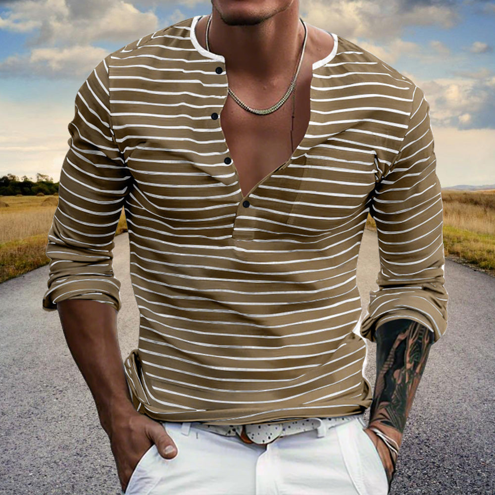 Men’s Striped Long Sleeve Henley-Style Casual T-Shirt – A timeless blend of comfort, durability, and style, designed for the modern man’s everyday adventures.