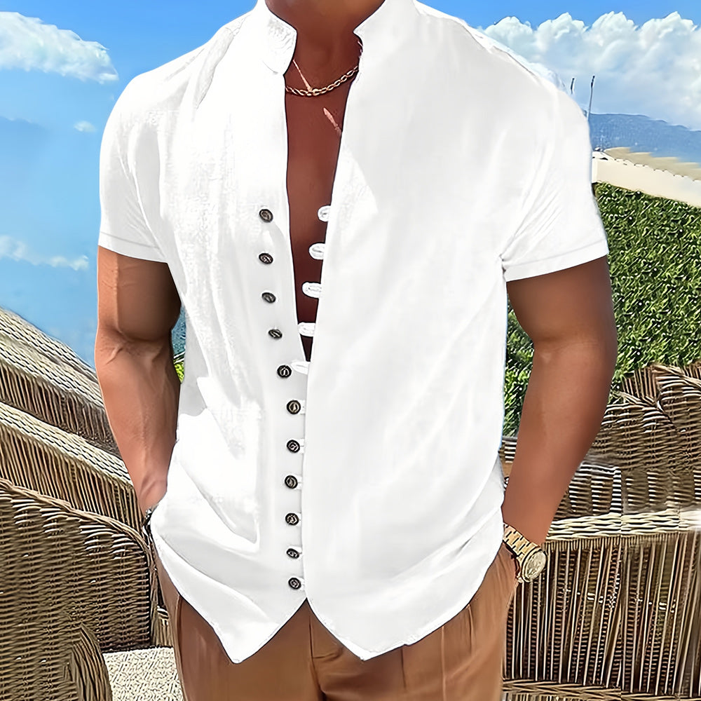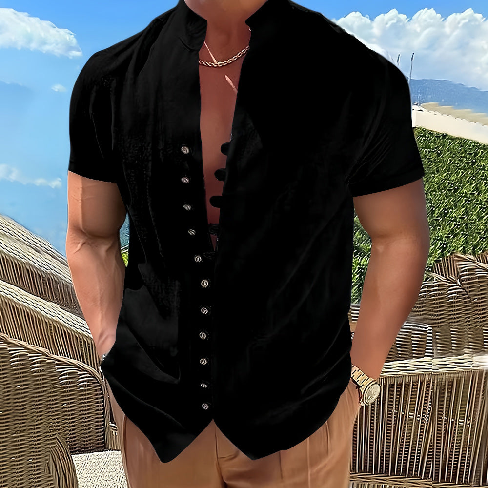 This men’s short-sleeved summer shirt blends modern design with fine craftsmanship for a standout look. Featuring a unique button detail, it’s the perfect piece to elevate your summer wardrobe. Whether you're dressing for casual days or semi-formal occasions, this shirt adds effortless charm and sophistication.